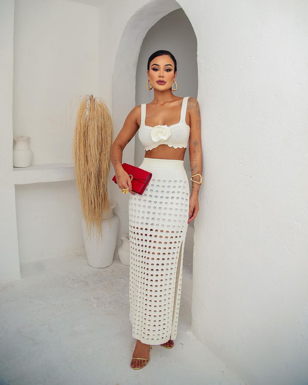 Saia longa vazada com forro que vai da cintura até a coxa.